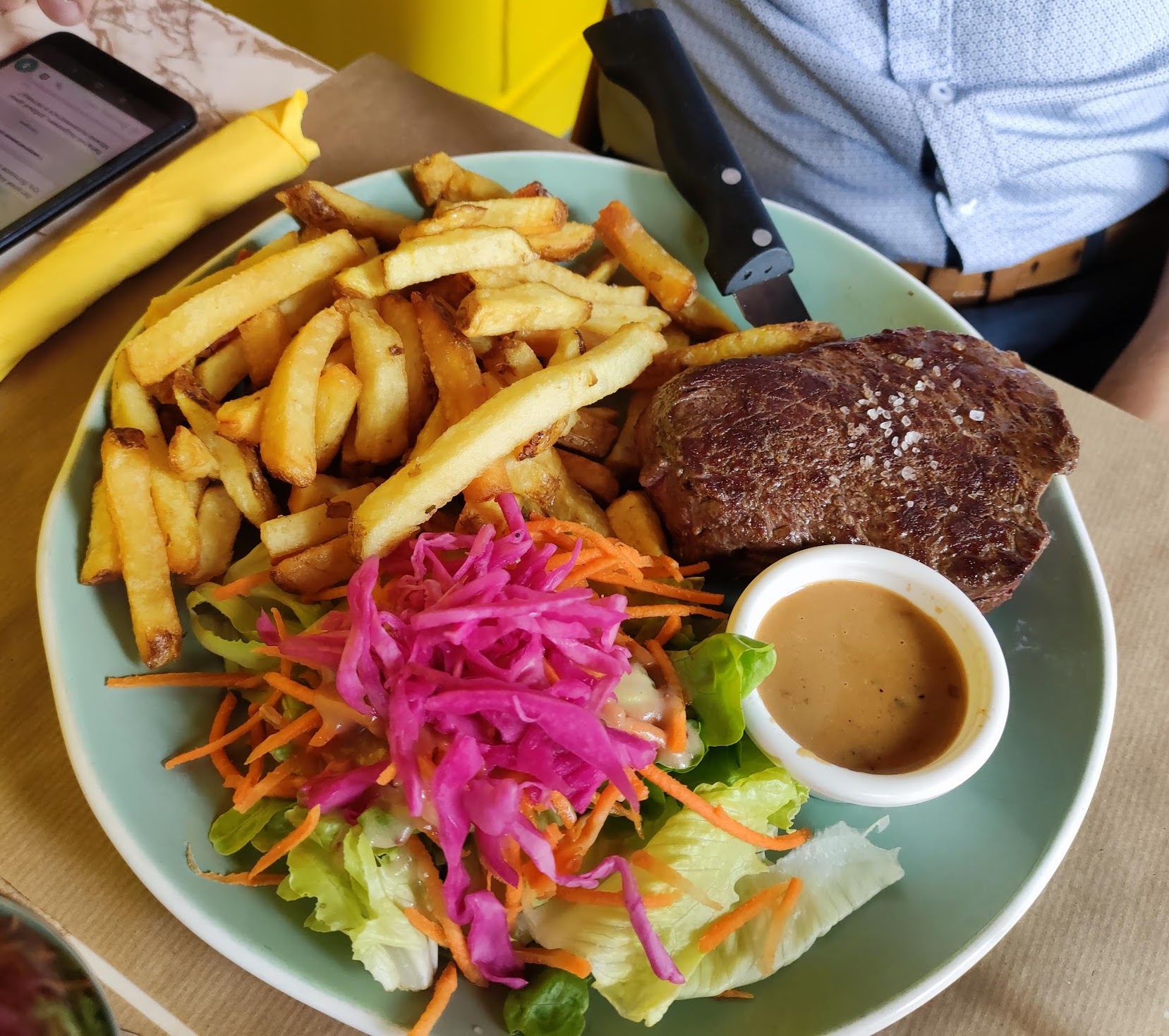 On y est venue avec mon père un peu tard pour manger le samedi midi, nous avons été très bien reçu le rumsteak était très bon et à la cuisson demandé les frites très bonnes aussi. Mention spéciale pour le cheesecake délicieusement onctueux 🤤
